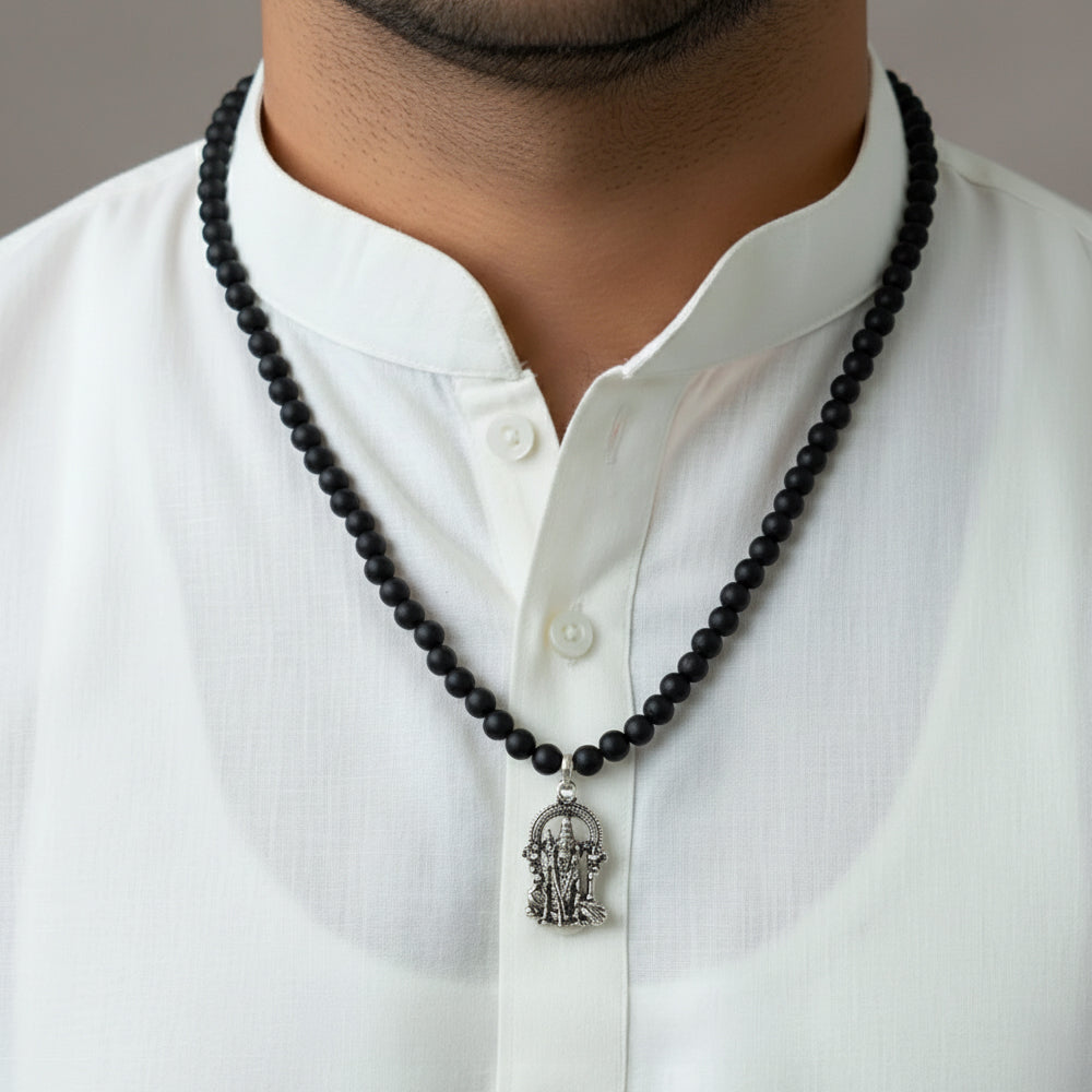 Karungali Mala with Murugan Dollar: A beautifully crafted Karungali bead mala featuring a Murugan pendant.